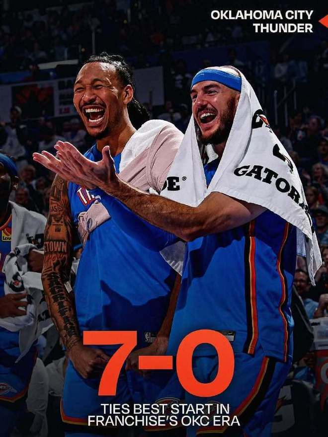 再往后,雷霆继续顺风顺水击败老鹰、独行侠、国王、奇才与鹈鹕,从而成为新赛季至今唯一保持全胜战绩的球队。雷霆连续两个赛季开局7连胜,成为历史第3支做到该点的球队。