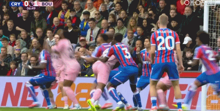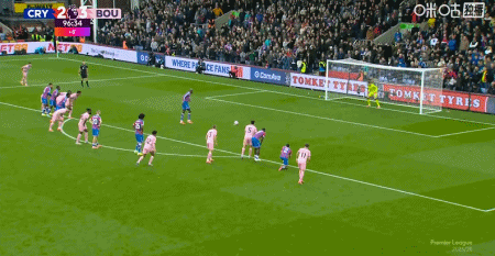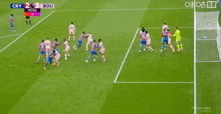 第90+7分钟,格伊造点,马特塔主罚点球命中,水晶宫3-0伯恩茅斯