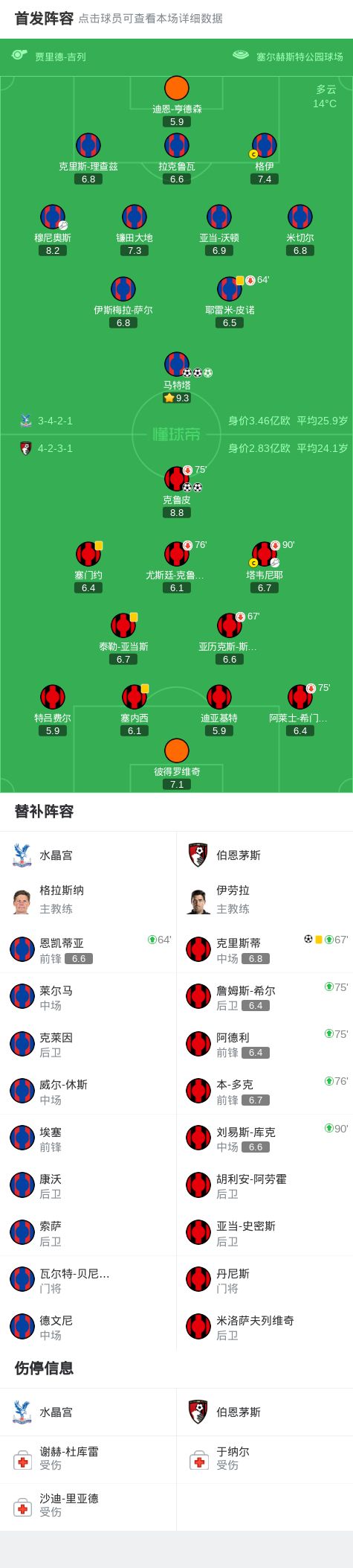 水晶宫3-3伯恩茅斯, 马特塔帽子戏法,克鲁皮双响